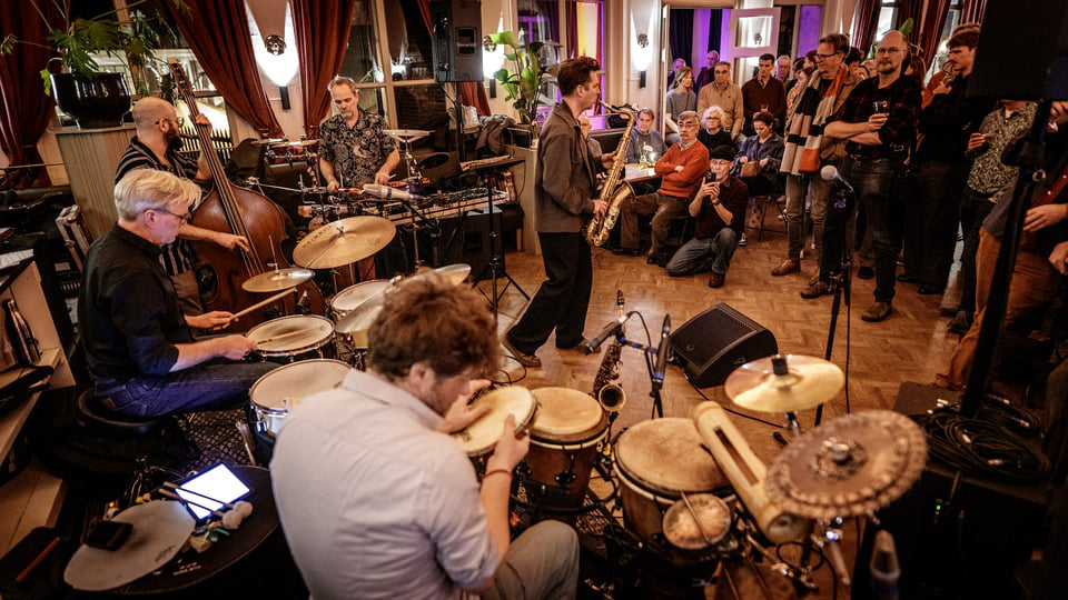 Bart Wirtz et les Percussionistes traden in het kader van de Leidse Blues- en Jazzweek dinsdagavond voor de allereerste keer op in grand café De Burcht. © Foto Hielco Kuipers